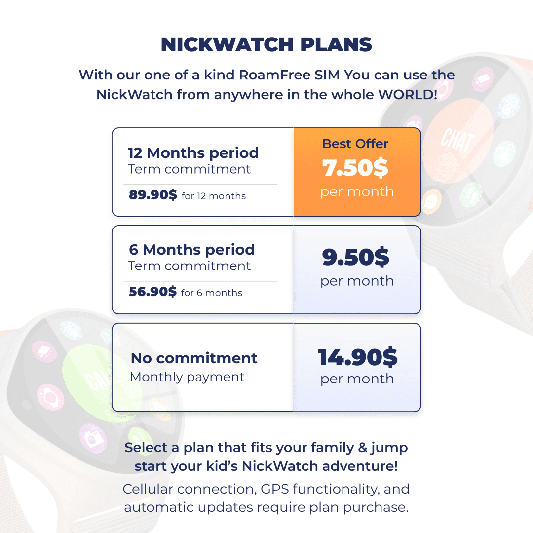 Your subscription will automatically renew according to the plan you purchased, providing access to games, experiences, regular software updates, and all the great connectivity NickWatch offers, including 2-way messaging and calls anywhere in the world. You can cancel your renewal at any time through the NickWatch app or contact our customer support.